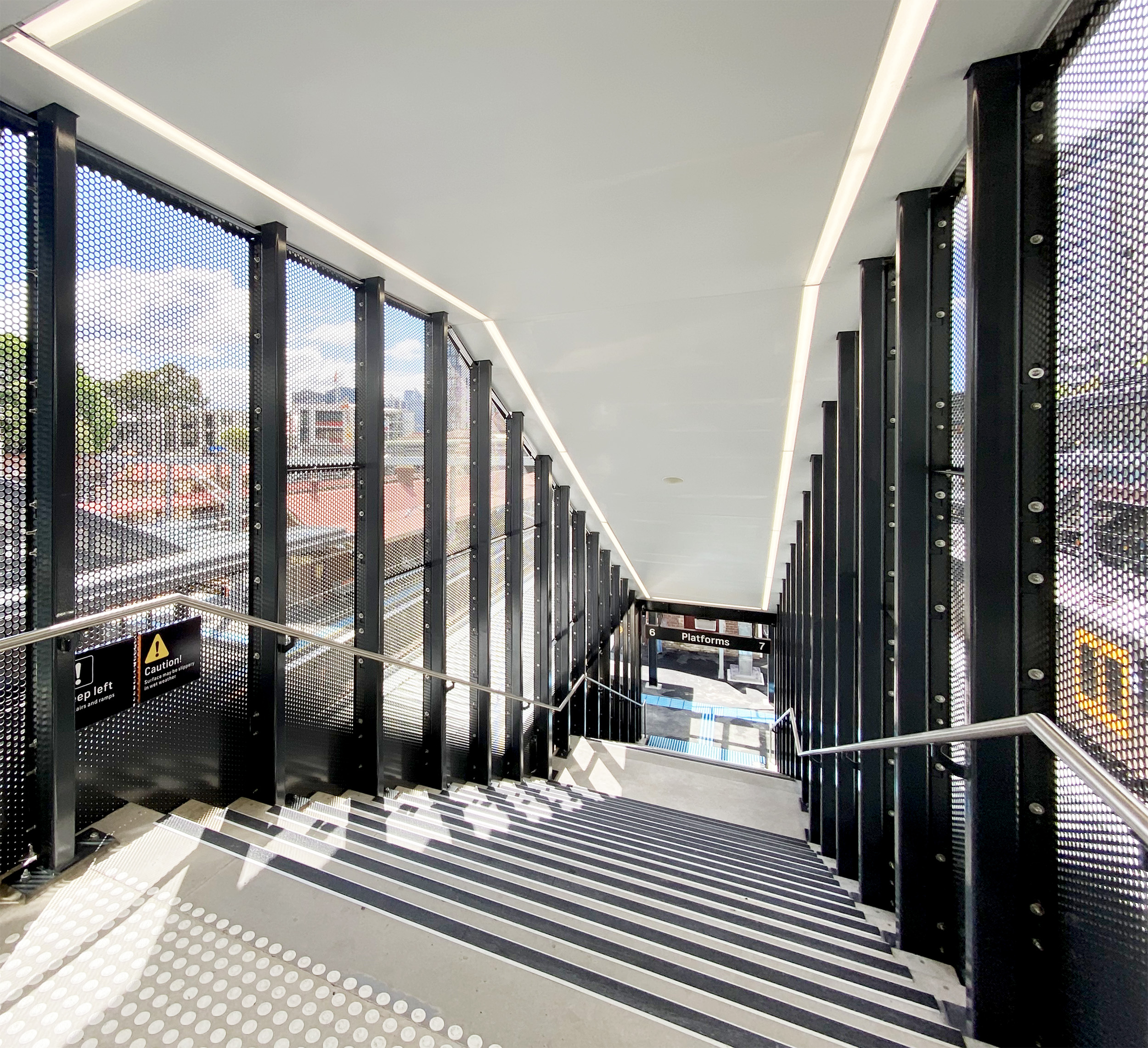 The Eveleigh Rail Yards are important for being the birthplace of the workers unions, and for advancing the Industrial Age in modern Australia, providing employment to both Aboriginal and settler populations. A diagonal steel structure was chosen for the concourse bridge which references the Industrial Age. These support floating perforated façade screens reinterpreted as Steam. This diagonal structure is also experienced in the concourse ceilings, picking up the colours of the recently completed Gibbons Street Entrance façade of yellow, orange, and red.