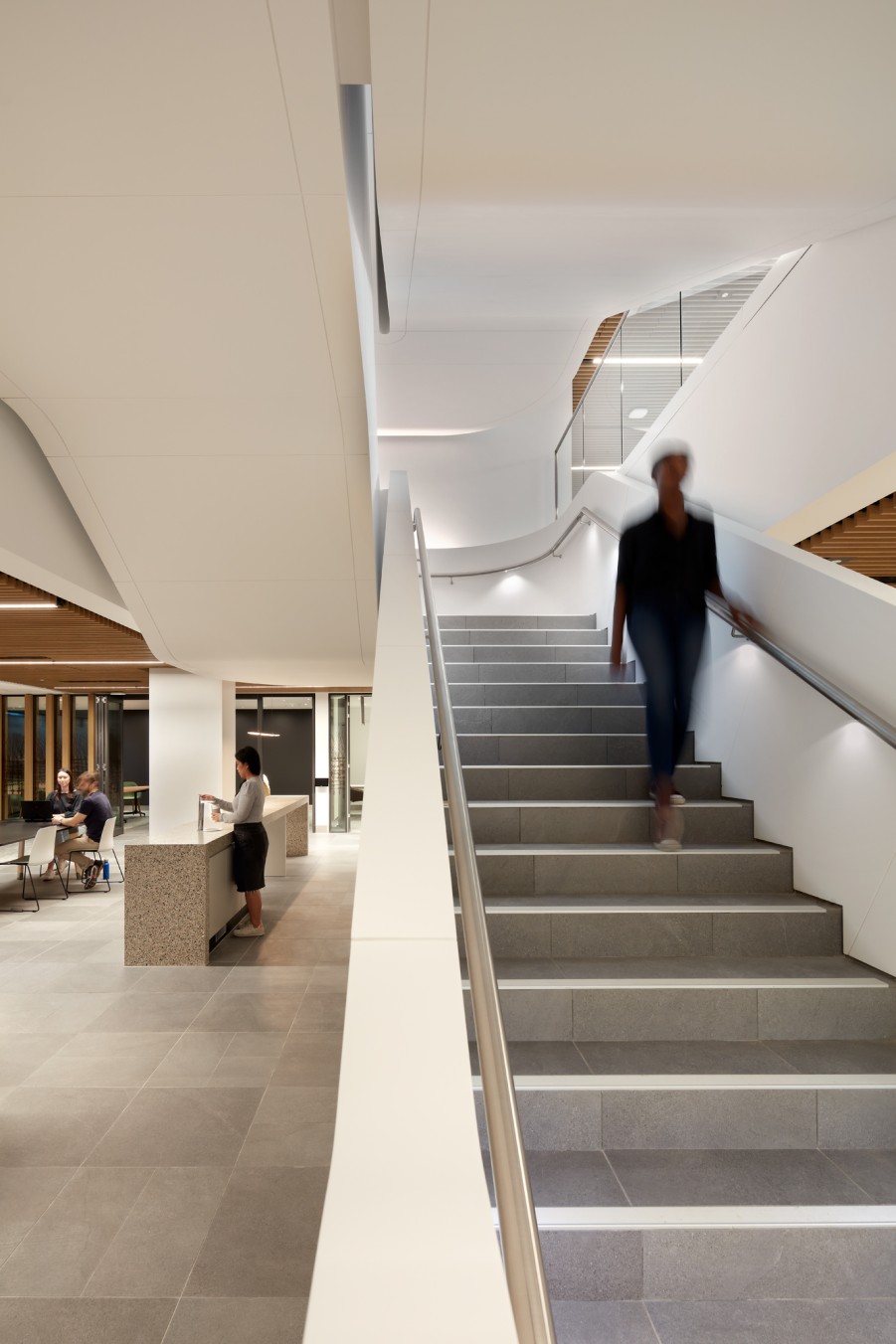 The health and wellbeing of the users is a key driver of the design. A cohesive warm, timeless and non-institutional look and feel is created through selection of natural colours and material palette. Spaces are adaptable, encouraging reflection, collaboration, privacy and social activity. Large windows and glass room partitions connect to the surrounding environment, bringing natural light and district views deep into the floor plan.