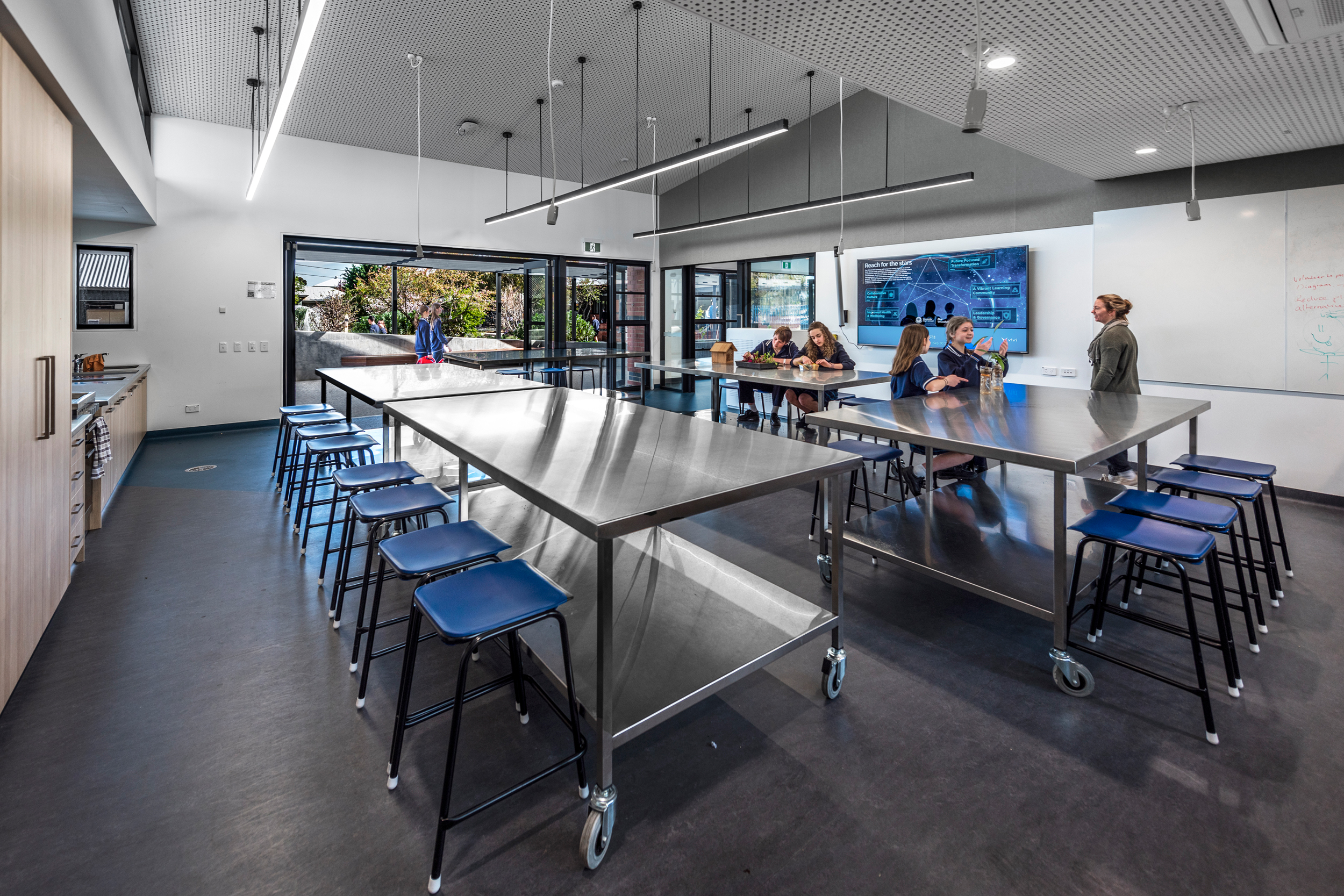 The Food Technology spaces are split by a shared General Learning Area (GLA) to promote secondary wellbeing and educational activities. The GLA also functions as a dining space for the VET program. The kitchens operate independently or connect digitally to enable team teaching between the two Food Technology areas.