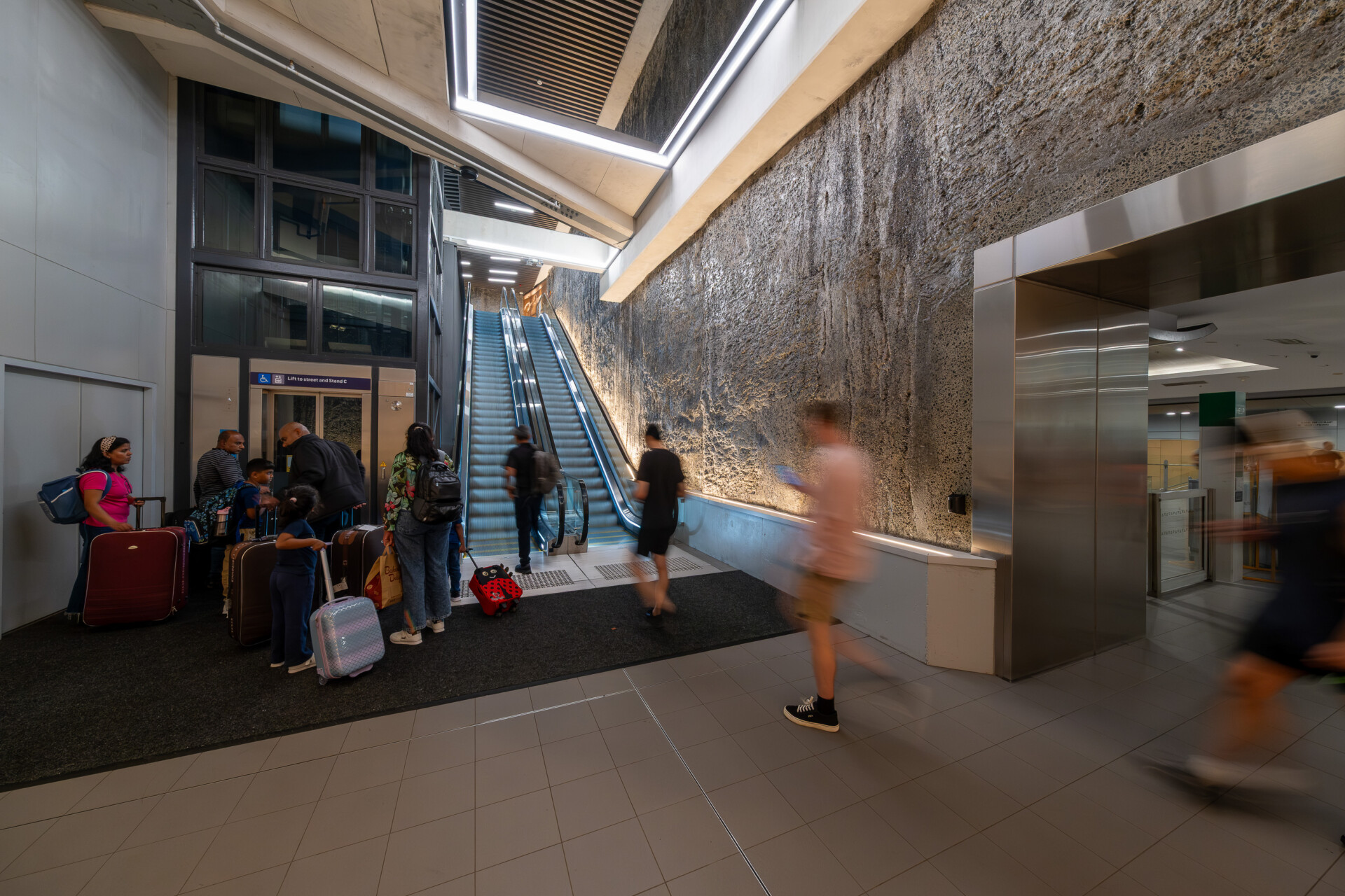 This ‘build-less’ approach underscores the studio’s sustainability agenda which includes a Sustainability Action Plan (SAP) and Climate Active-certification nationwide. By removing the traditional lining to the underground walls, the space inside the new station is maximised while minimising the use of materials, including cladding, framing and the like. Exposed concrete walls were cast against the earth and once set, the interior excavated out. The resulting pattern on the concrete walls is a product of the diaphragm wall process and soil composition, which creates a large open underground space that expresses the nature of the earth around it. Dramatic lighting enhances the commuter experience and interpretive artworks honour Mascot’s rich aviation heritage.