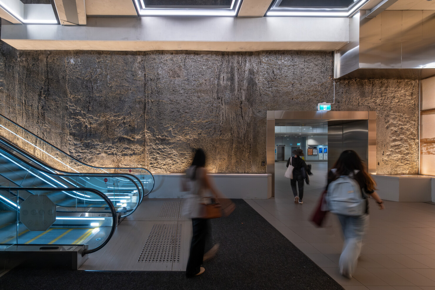 Beneath the surface, DesignInc designed a new structure adjacent to the existing underground station ‘box’, creating a dramatic break-through at the concourse level. Passengers now move through this newly excavated volume where innovation shines through the excavated underground façade. Critical engineering challenges shaped the process, including poor ground conditions and proximity to adjacent apartment towers with deep basements. The solution demanded precision and creativity in reaching a solution that suits passenger experiences, rail operations and the locale.