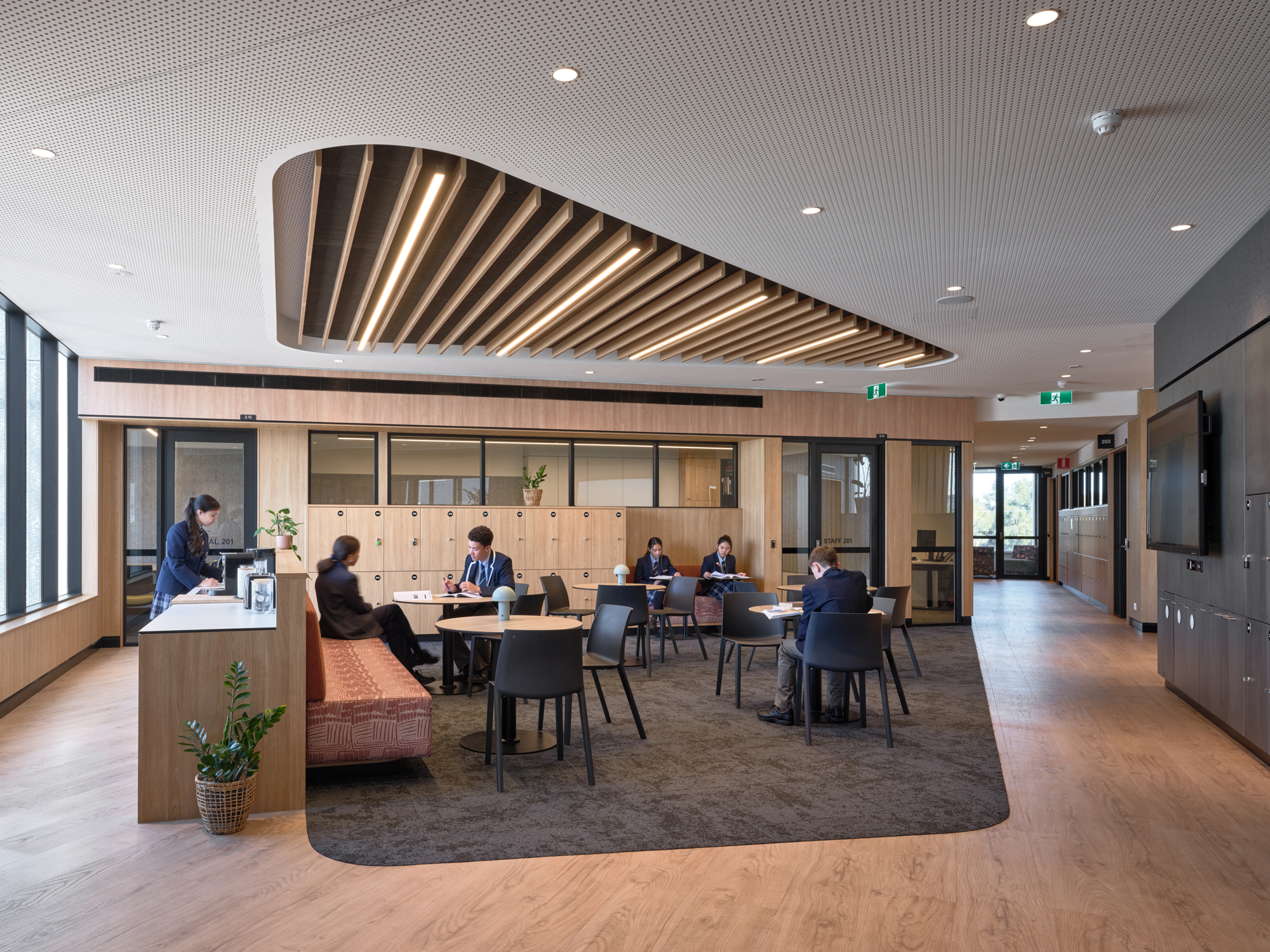 As the initial phase of a comprehensive campus master plan, this building lays the groundwork for scalable growth and seamless integration with future stages. The design promotes adaptability through flexible classrooms, learning commons, and specialist spaces, including science and technology, media, fablab, and a gymnasium, supporting diverse teaching methods and learning styles. Independent zones for senior students encourage self-directed study and tertiary preparation, while younger students benefit from exposure to aspirational environments. Sustainability is integral, with low-carbon materials, solar readiness, gas-free systems, double-glazed windows, and energy-efficient lighting prioritising wellbeing and environmental responsibility.