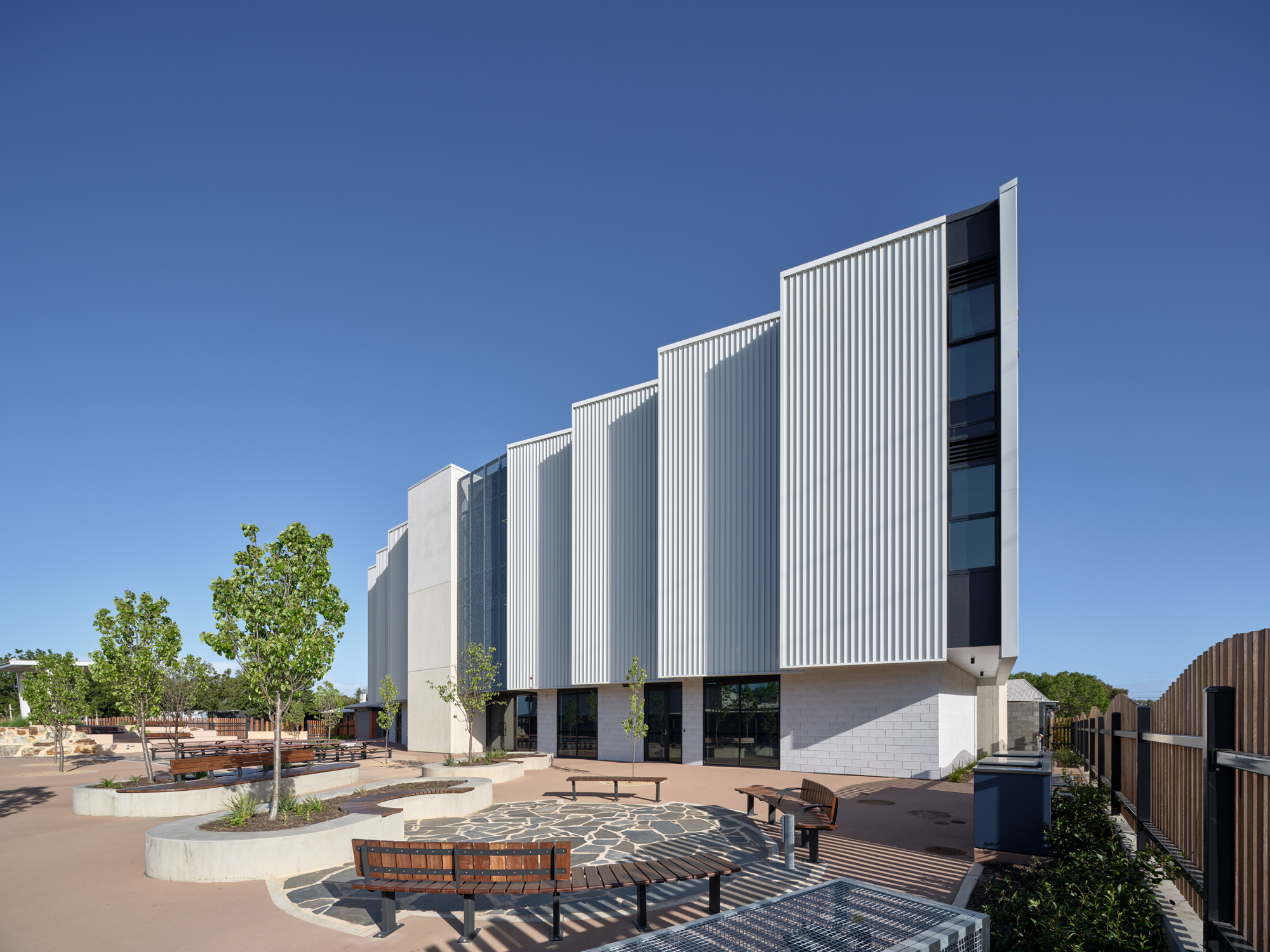 Responding to a highly constrained site, the building adopts a three-storey vertical solution that optimises every square metre while preserving openness and connectivity. Glazed stairwells and open circulation spaces foster strong visual and physical links between levels, enhancing interaction and natural light penetration. Early enabling works addressed complex site challenges, including power infrastructure removal, easement restrictions, and traffic management at the busy Causeway and Bower Road intersection, allowing construction to proceed seamlessly alongside ongoing school operations. Relocation of the Early Learning Centre facilitated future growth within the tight footprint.