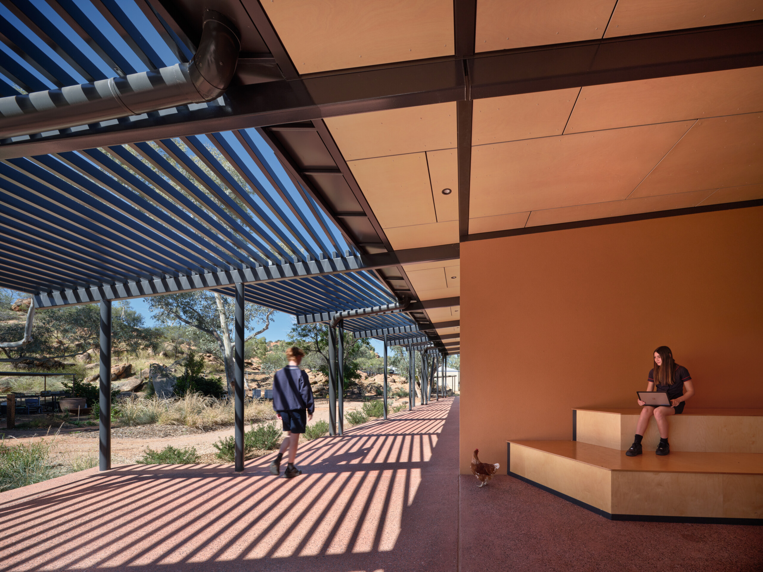 Sustainability is embedded throughout, supporting cross-disciplinary learning and practical engagement with agriculture and livestock studies. Passive solar design, shading, ventilation, and durable materials respond to the Central Australian climate, while photovoltaic panels, solar power, stormwater harvesting, and battery storage reduce environmental impact. Natural light floods learning spaces through extensive glazing, creating bright, uplifting environments that enhance wellbeing.