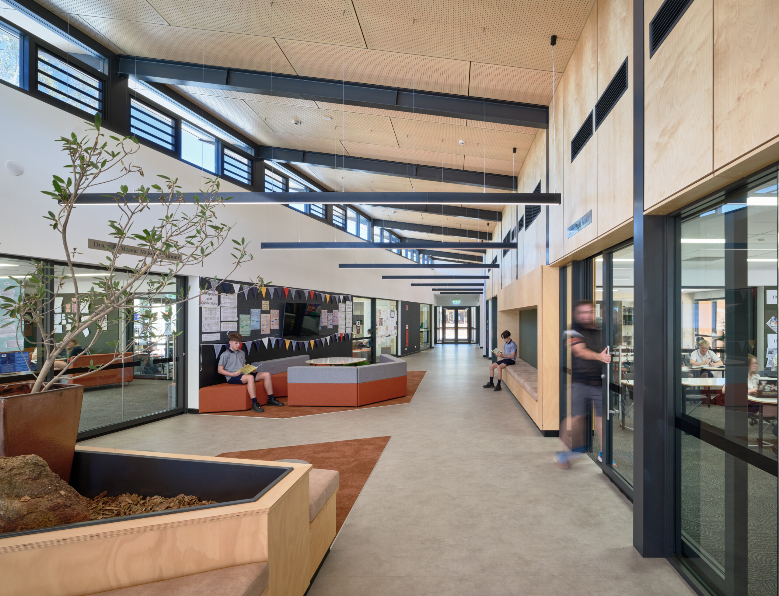 A central east–west spine transforms a previously overlooked corner of the campus into a vibrant focal point, linking learning commons, GLAs, and SLAs with transparency, sliding doors, and flexible layouts. Façade and roof design balances aesthetics with function, manipulating light and shade to provide comfort. Inspired by the yarning circle, the circular roof opening serves as a central gathering space that fosters conversation, reflection, and play, while casting dynamic shadows that subtly mark the passage of the day—an engaging feature that sparks curiosity and delights students. The entrance and interior spaces are open, inviting, and adaptable, embodying the school’s vision: ‘Discovering our place in the world through an adventurous education.’ Together, these features create a learning environment that celebrates exploration, community, culture, and resilience.